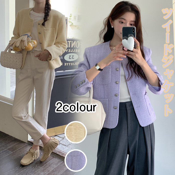 ツイードジャケット レディース 長袖ノーカラージャケット ショット丈ツイードコート 春コートアウター 秋服 大人韓国風 通勤 オフィス 結婚式 入学式 卒業式 ビジネス
