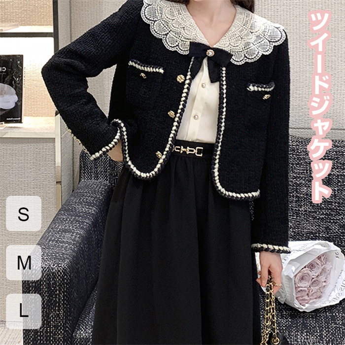 ツイードジャケット レディース 春 ジャケット アウター ショート 羽織り ノーカラージャケット ツイード 長袖 ブラック フォーマル ママ 母親 七五三 お宮参り かわいい 大人可愛い