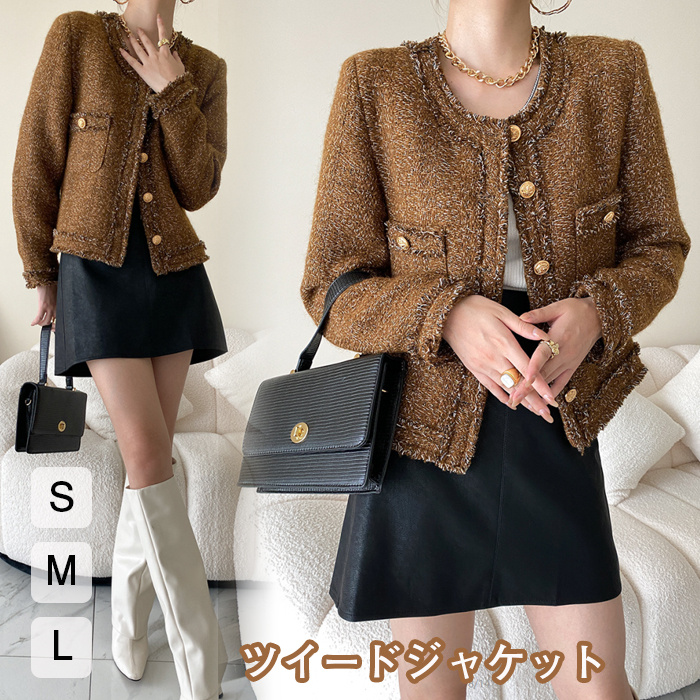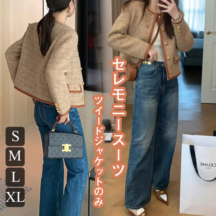 セレモニースーツ ツィードジャケット ノーカラージャケット レディース アウター ノーカラージャケット ツイード 金釦 金ボタン 通勤 オフィスカジュアル ブラウン ママスーツ