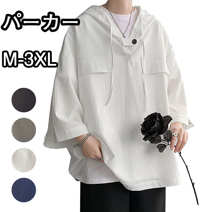 パーカー メンズ 七分袖 春夏 無地 薄手プルオーバー おしゃれ フード付き ゆったり 大きいサイズ 黒 白 グレー ネイビー M-3XL
