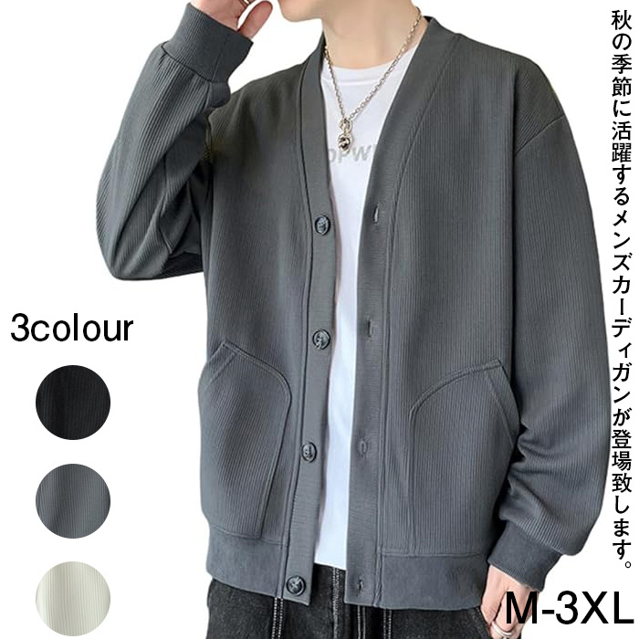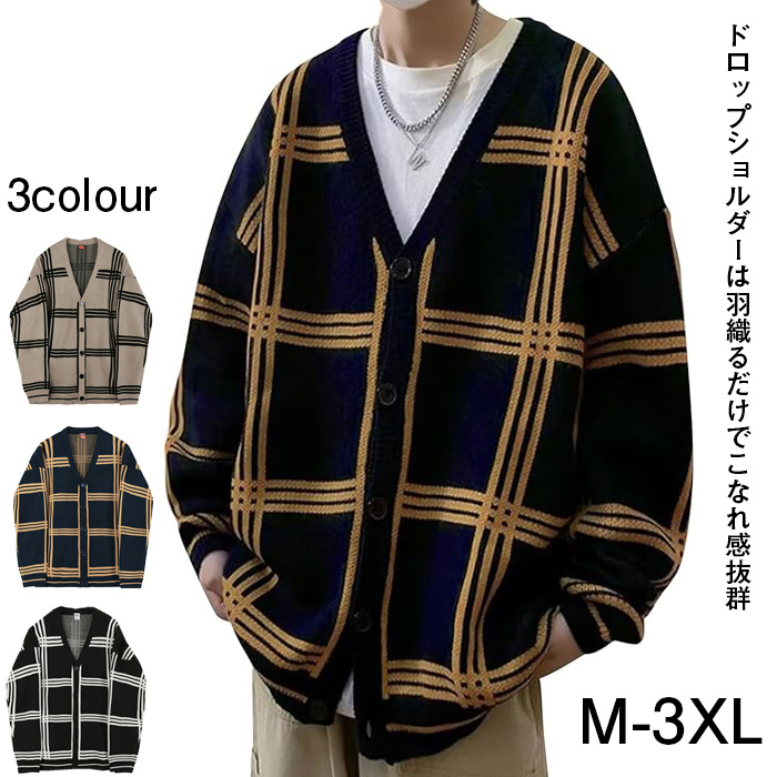 チェック柄 ニット カーディガン ソフトタッチ ゆったり Vネック 長袖 秋 冬 メンズ カーキ色 ブラック イエロー M-3XL