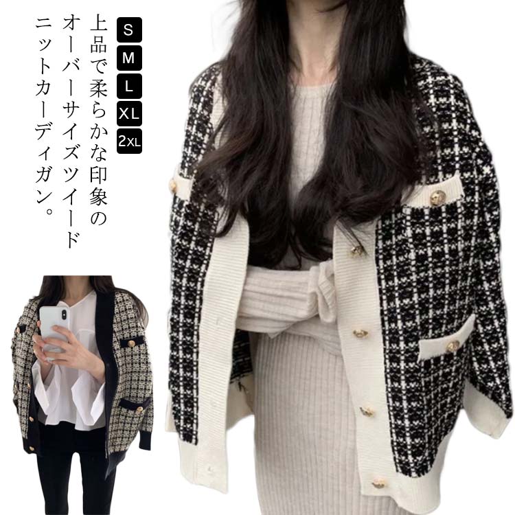 ツイードジャケット ゆったり感のあるオーバーシルエットでガーリーにキマる ニット カーディガン ラグランスリーブ ミディアム丈 ツイード風 クラシカル ノーカラー ポケット付き