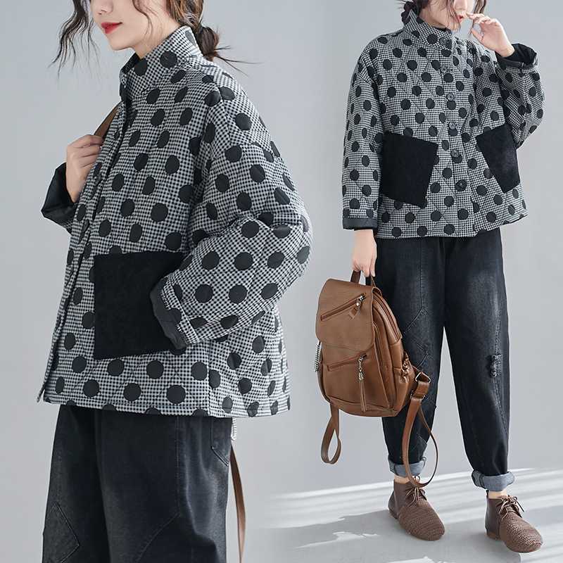 冬新作 レディースアウター キルティングコート ショートコート コート 中綿 ジャケット ドット柄 水玉 ショート丈 ゆったり 体系カバー 大人かわいい 30代 40代 50代 グレー