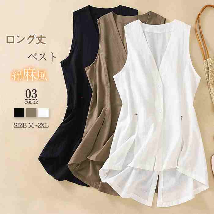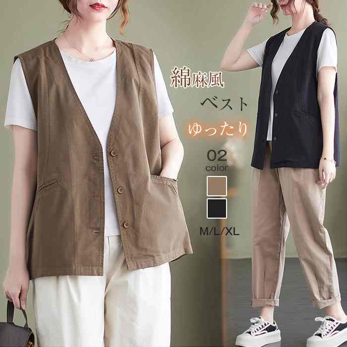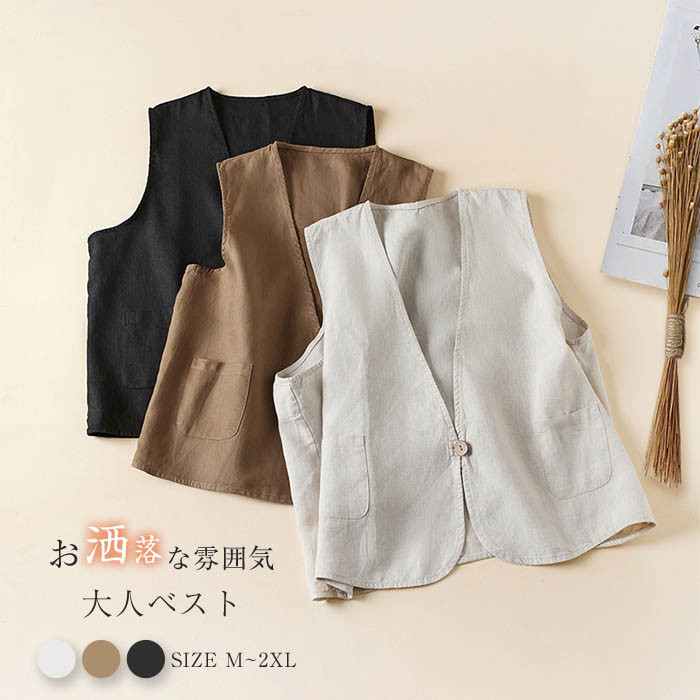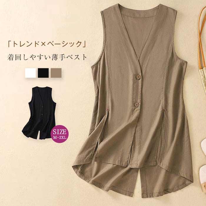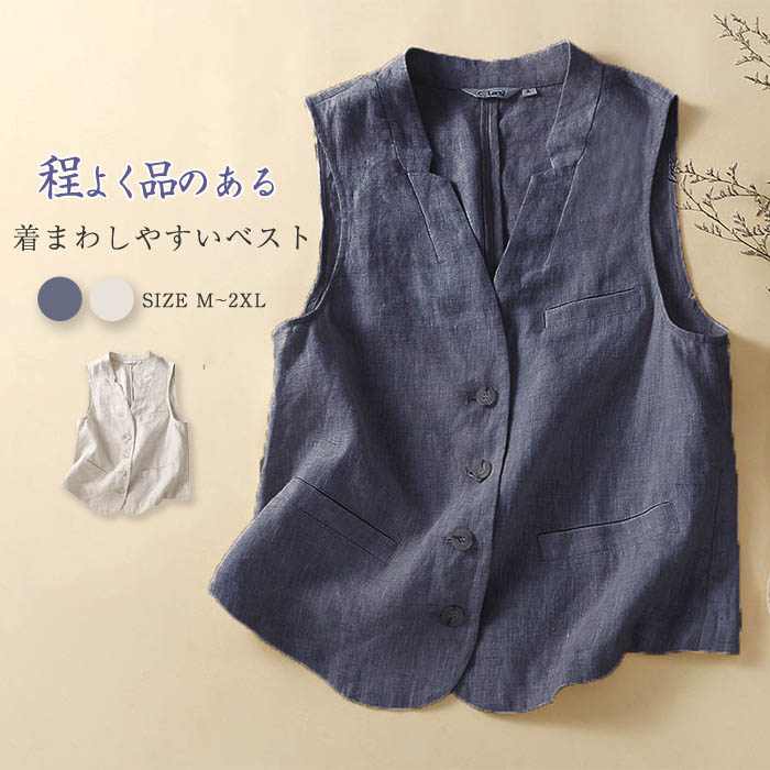 ベスト レディース 春 夏 前開き 薄手 vネック ジレ レディース 夏 薄手 ベスト 綿麻混風 ゆったり 夏 きれいめ ノースリーブ オシャレ 無地 ベスト レディース