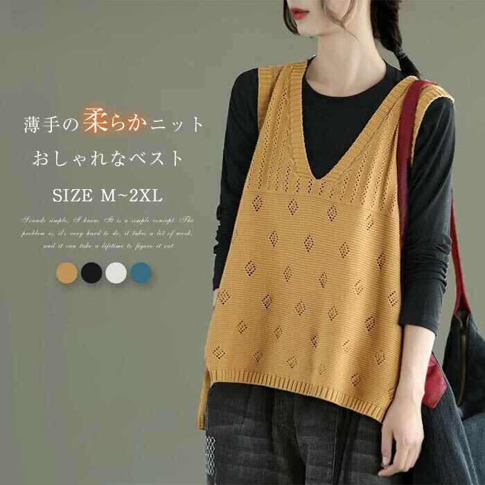 ニット ベスト レディース 春 秋 春秋 トップス チョッキ ニットベスト 春ベスト おしゃれ 着回し 体型カバー ノースリーブ Vネック 無地 透かし編み 裾前後差 20代 30代 40代 50代