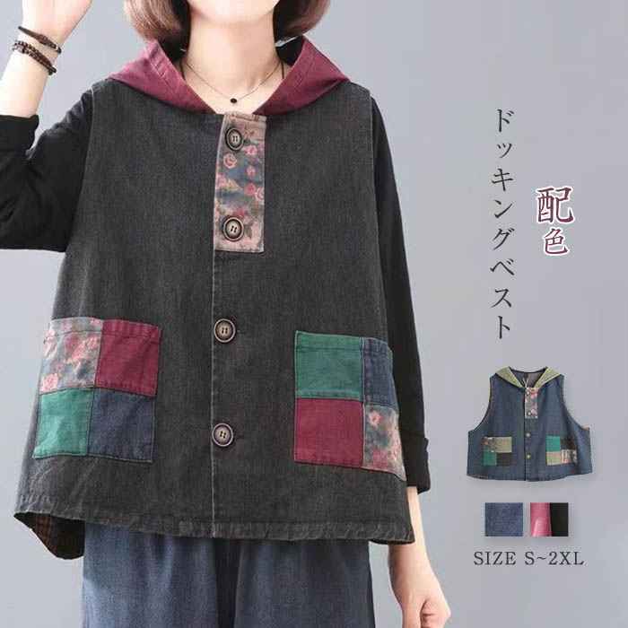 ベスト レディース 春 夏 秋 デニム トップス レディースベスト ジャン ジージャン ナチュラル おしゃれ 前開き 春夏秋 ポケット ドッキング 柄 配色 ノースリーブ 日常 30代 40代 50