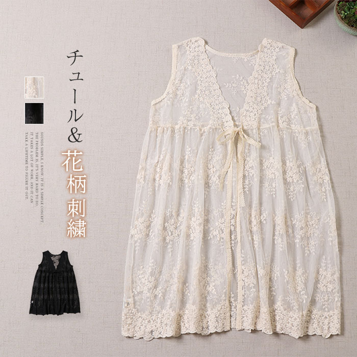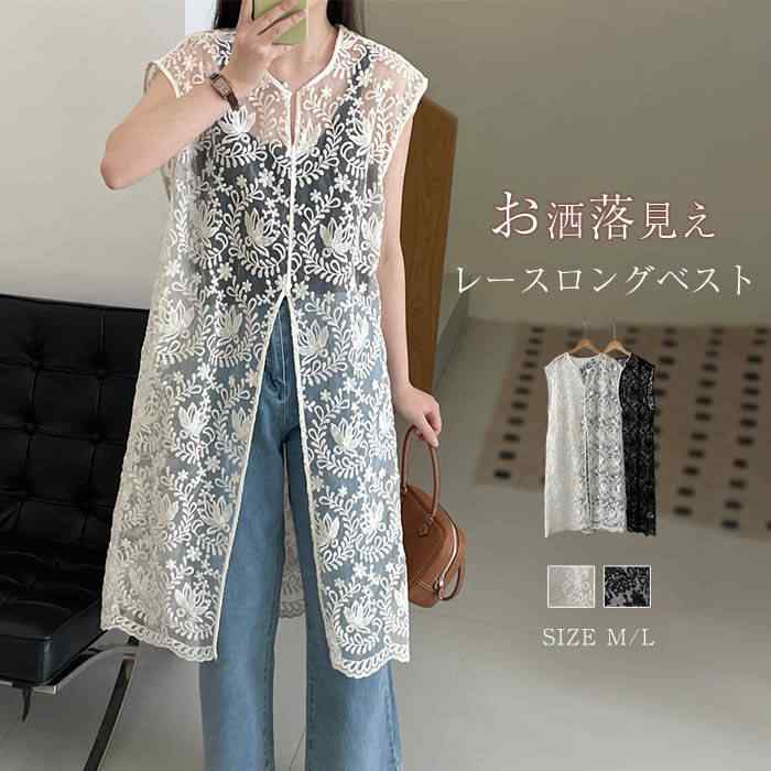 ロング丈刺繍ベスト 刺繍ジレ ししゅうベスト 総柄 重ね着風 透け フレンチスリーブ ベスト レディース ファション キレイめ 可愛い レースジレ レースベスト 20代 30代 40代 50代