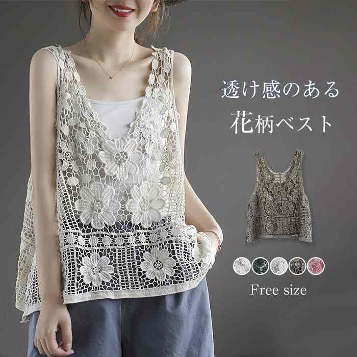 ベスト レディース 春夏 花柄 レース ベスト 可愛い おしゃれ ネック 春 ベスト 薄手 トップス ゆったり ショート丈 透かし編み 花柄 カワイイ 夏ベスト プルオーバー