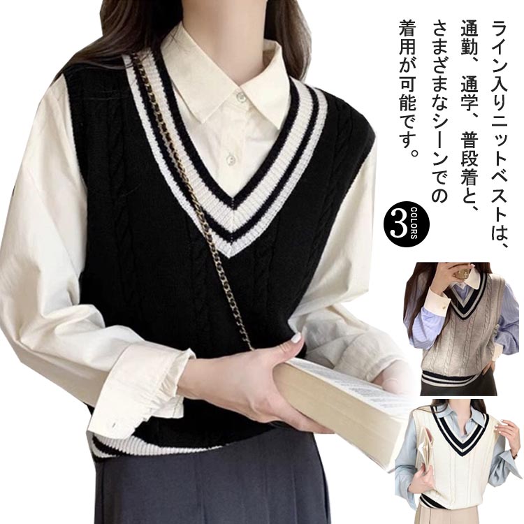 ニットベスト レディース 学院風 セーター 配色ライン スクールベスト 制服 Vネックレディースファッション トップス ベスト ジレ