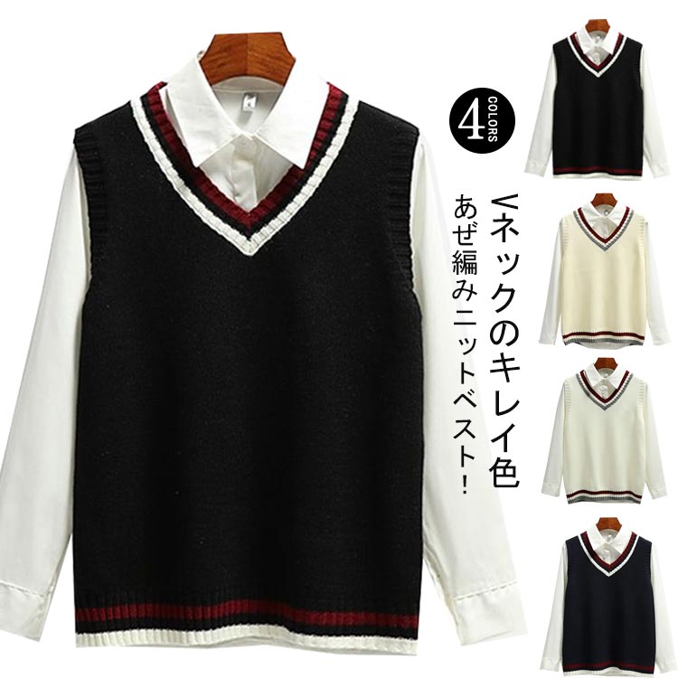 ニットベスト レディース 学院風 セーター 配色ライン スクールベスト 制服 ネックレディースファッション トップス ベスト ジレ