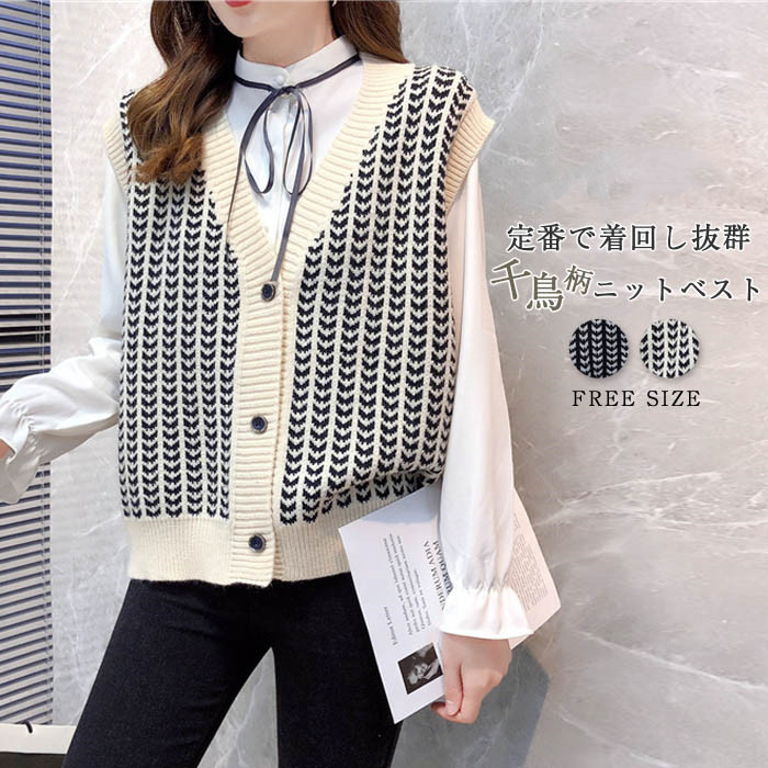 千鳥柄 ニット ベスト サマー ベスト レディース 前開き ニットベスト 柄 プルオーバー おしゃれ ベスト vネック 春 秋 冬