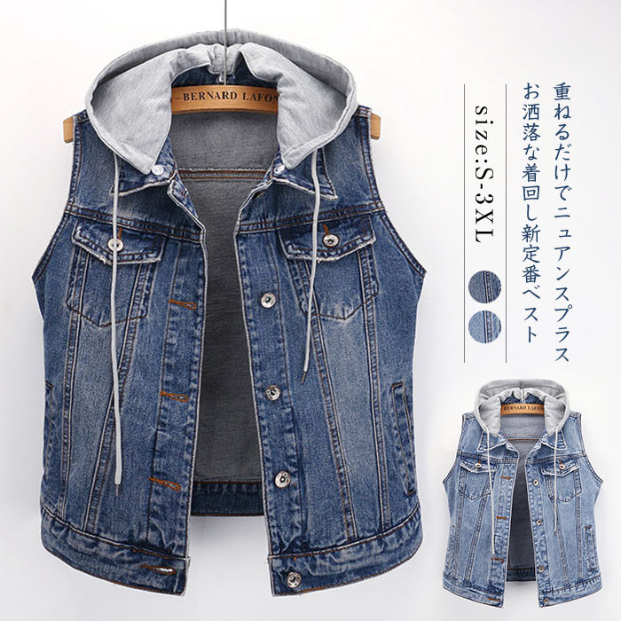 デニム ベスト レディース 春 ジレ ベスト レディース 春夏 ベスト レディース おしゃれ ベスト 春 デニム 前開き トップス ベスト ジャン 可愛い フード付き 取り外し可能