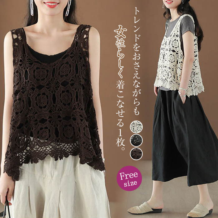 ベスト レディース 春夏 ニット ベスト おしゃれ ベスト トップス ベスト サマー ベスト 花柄 春ベスト プルオーバー 透かし編み ノースリーブ 夏 重ね着