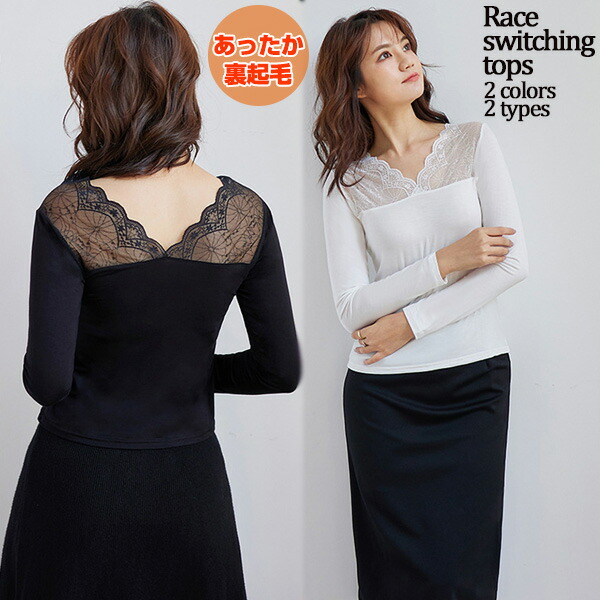 17 レース付あったか裏起毛インナー 暖か裏起毛トップス カットソー 長袖 インナー ネック バーゲン