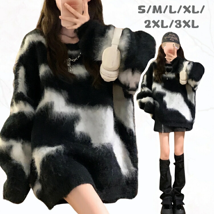 ファッション ふんわり セーター ブラック 絞り染め レディース けだるい ニット 保温 暖か 防寒 華奢見え 秋 冬 春 通勤 通学