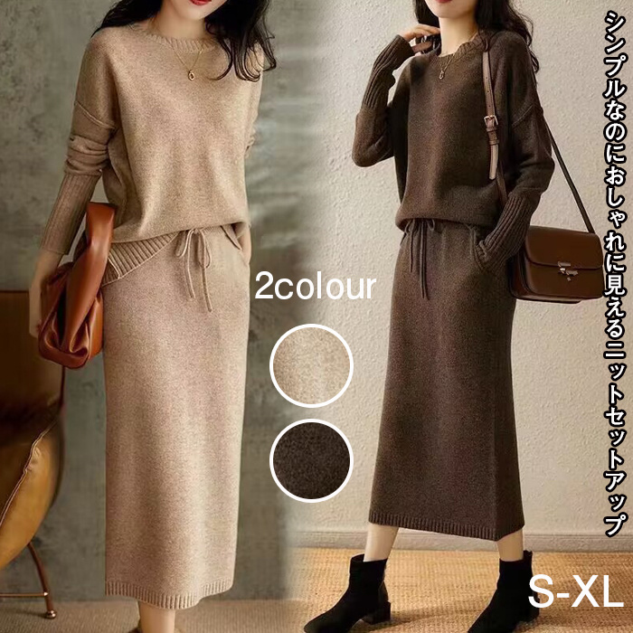 ニットセットアップ 秋冬 ニットトップス ニットスカート ゆるニット カーキ色 コーヒー色 S-XL
