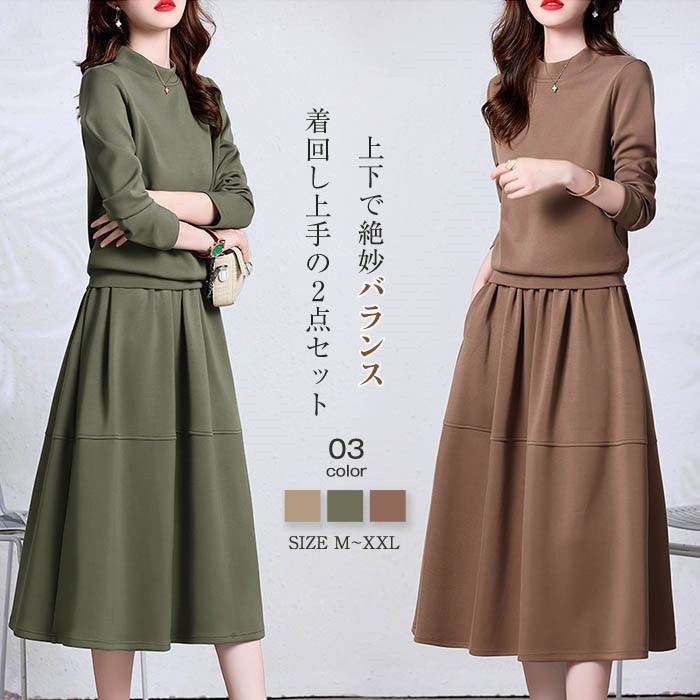 セーター スカート 2点セット レディース 長袖 ロングスカート 重ね着風 春秋 スウェット おしゃれ 綿 レイヤード風 -