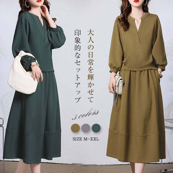 スカート セットアップ スウェット 2点セット レディース 春 秋 冬 上下セット Aラインスカート aライン フレアスカート ウエストゴム トップス キーネック バルーンスカート 無地 通勤