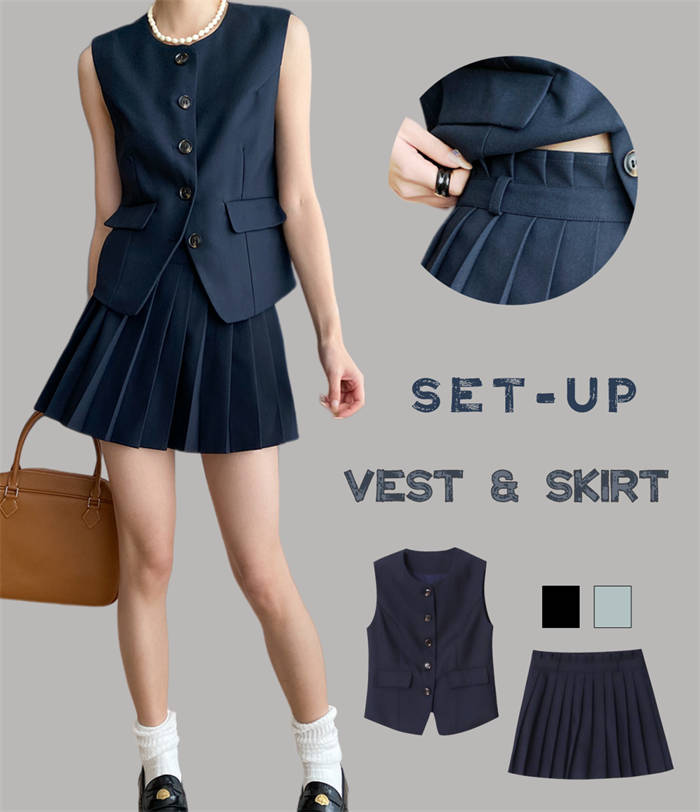 2点セット テーラードベスト スーツベスト トップス ノースリーブ ミニスカート プリーツスカート 上品 きれいめ 春 夏 秋