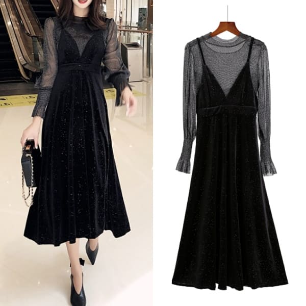 きれいめレディースファッション 韓国 ファッション レディース オルチャン お呼ばれ セットアップ ロングカフス キャミワンピ パーティードレス 春 秋 冬 パーティー お呼ばれ コーデ 結婚式 二