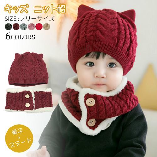 ニット帽子 マフラー 2点セット ベビー 赤ちゃん キッズ ジュニア アニマルフードのニット帽耳付き 子供 男の子 女の子 帽子