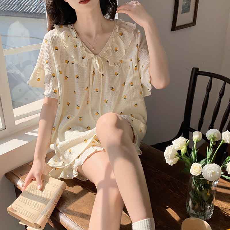 レディースパジャマ お姫風ルーム 天使風 寝間着 ギフト 部屋着 寝巻き ウェア上下2点セットトップス半袖&ボトムス短パン 快眠ナイトウエア 快適ルームウエア 春夏秋のおしゃれパジャマ