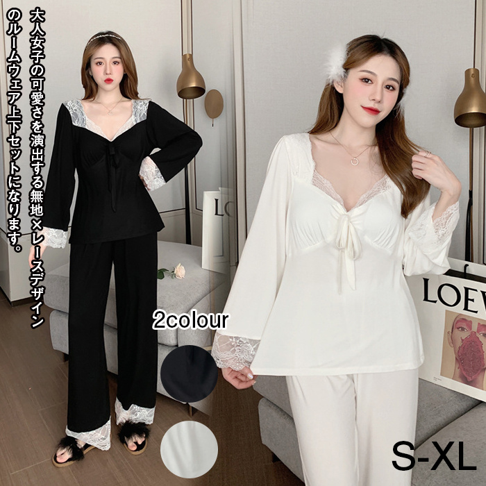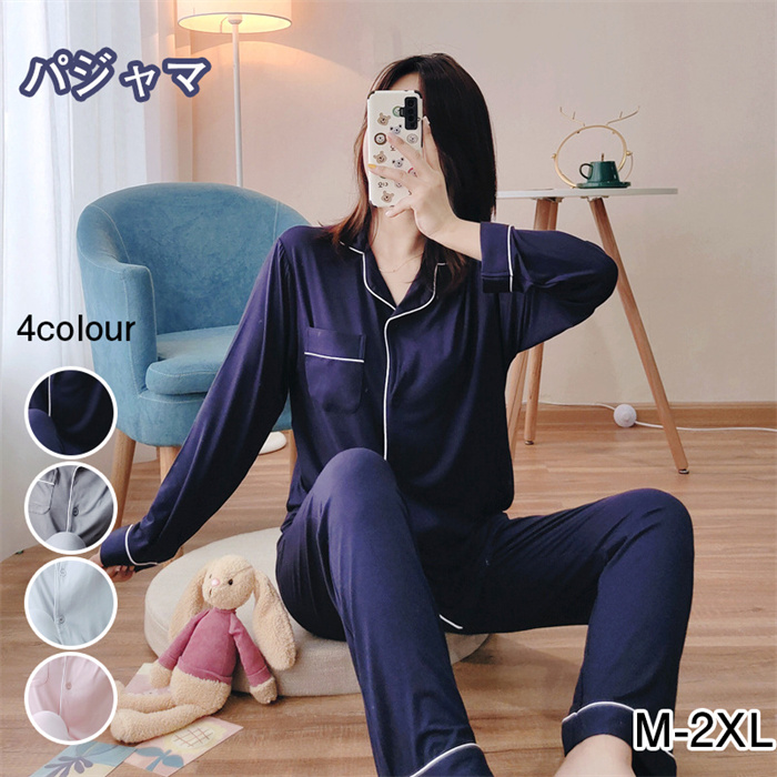 ルームウェア レディース 部屋着 パジャマ 長袖 トップス 2点セット Vネック ロングパンツ ストレッチ 寝巻き 快適 夏 秋 冬 部屋着 シンプル 無地 ウェストゴム