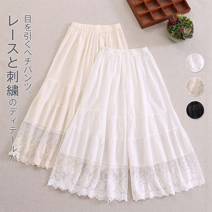 ペチパンツ ペチコート インナー パンツ レース ロング ワイド 春 夏 透け防止 重ね着 レイヤード 刺繍 ゆったり 大きいサイズ レディース ワイド おしゃれ きれいめ 下着 ナチュラル シンプル