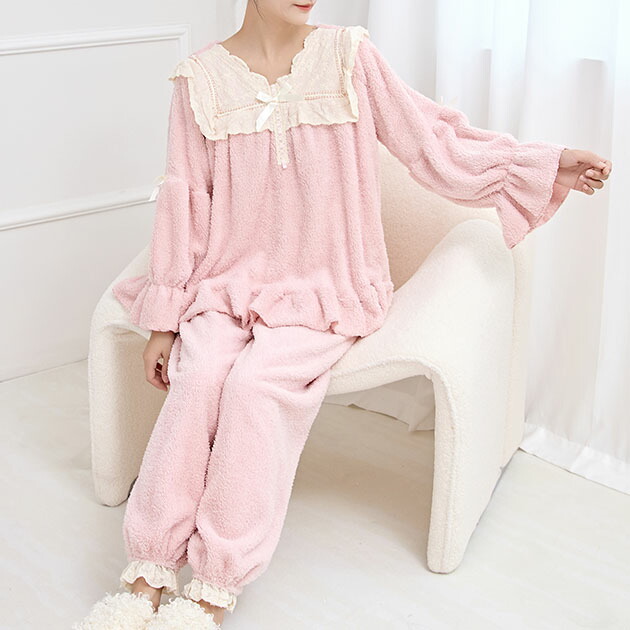 ネック フリル リボン ふわもこ ルームウエア 女性 レディース 女子 部屋着 パジャマ 秋 冬 プルオーバー キャンディ袖 レース 異素材 ゆったり リラクシー ふわふわ 毛布 厚手 保温 温活