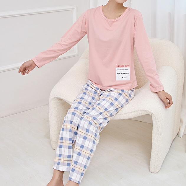 ラウンドネック 配色 チェック 長袖 ルームウエア 女性 レディース 女子 部屋着 パジャマ 春 秋 プルオーバー 単色 無地 シンプル カジュアル 定番 オールシーズン ゆったり 体型カバー 休日