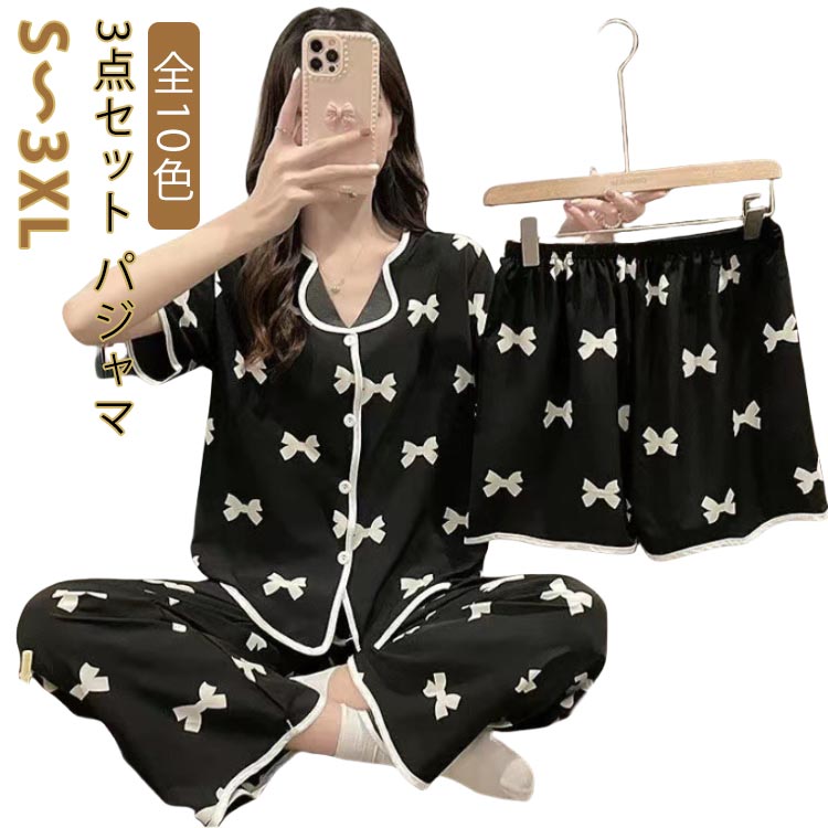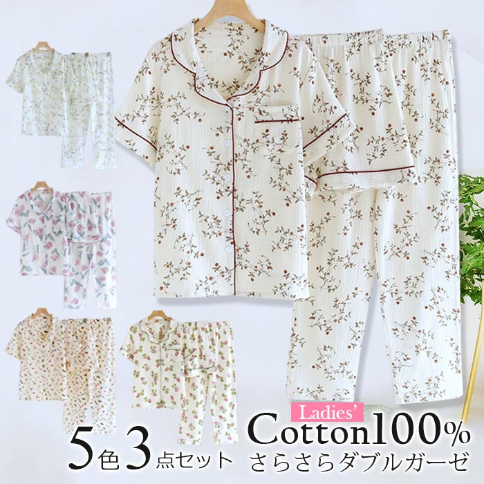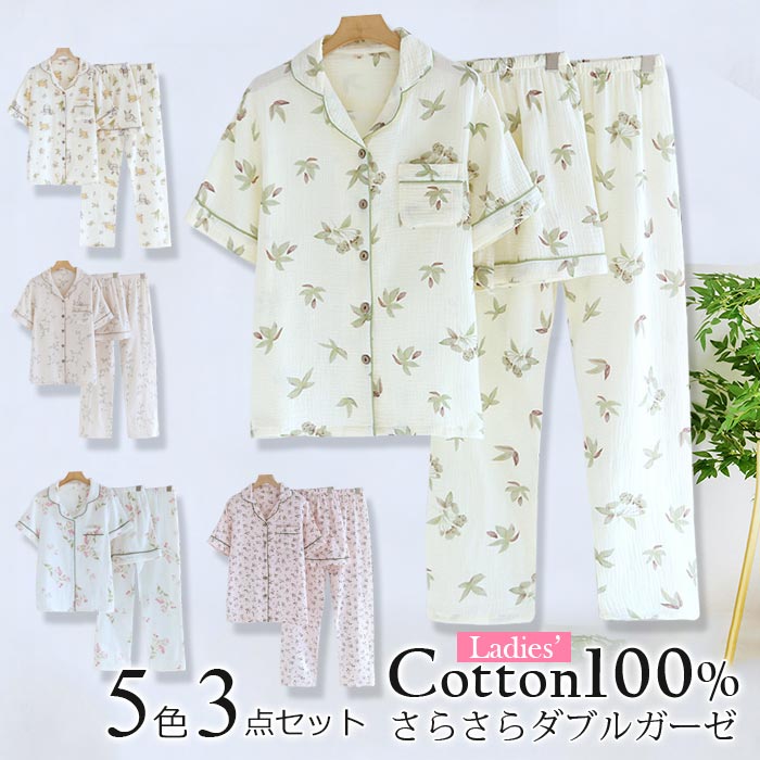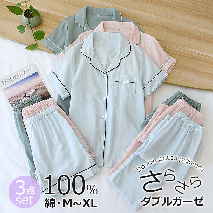 ダブルガーゼ パジャマ レディース 半袖 綿100% 3点セット パジャマ レディース 春 夏 上下セット ルームウェア ナイトウェア 可愛い 薄手 半袖 短パン 長ズボン 前開き M L XL 冷房