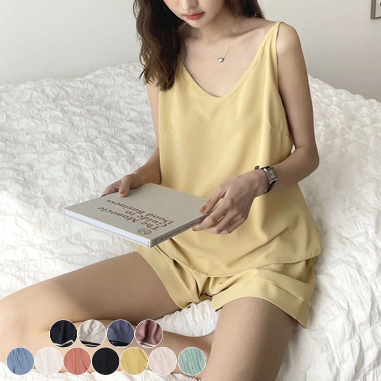 ルームウェア レディース パジャマ ショートパンツ キャミソール ノースリーブ サテン ルームウエア バイカラー おしゃれ セクシー ネック 夏 薄手 上下セット セットアップ 韓国