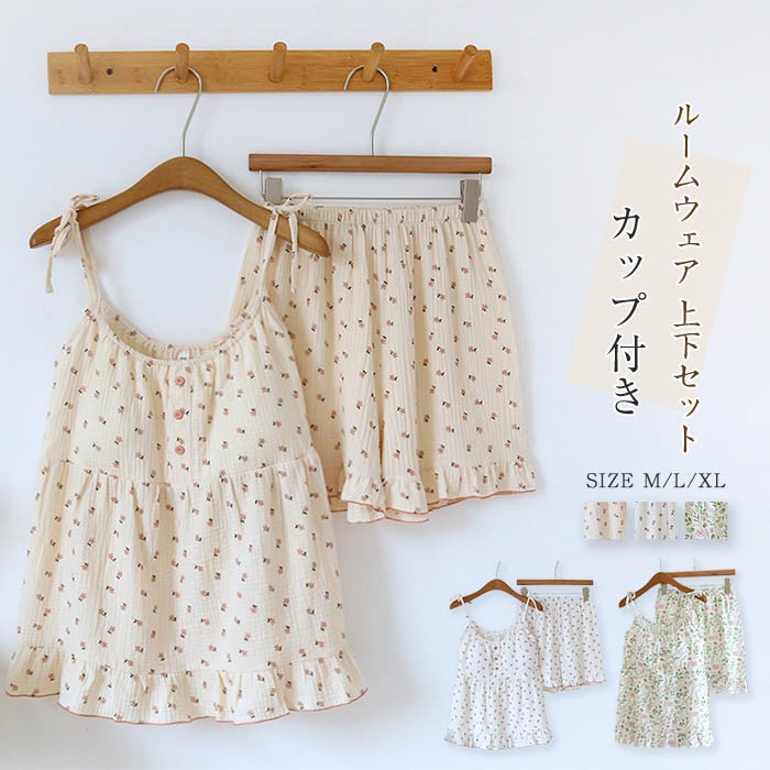ルームウェア 2点セット キャミソール 短パン 花柄ガーゼパジャマ ルームウェア 春 夏 花柄 部屋着 セットアップ 寝間着 寝巻き 上下セット 通気性良く 柔軟 コットン100%
