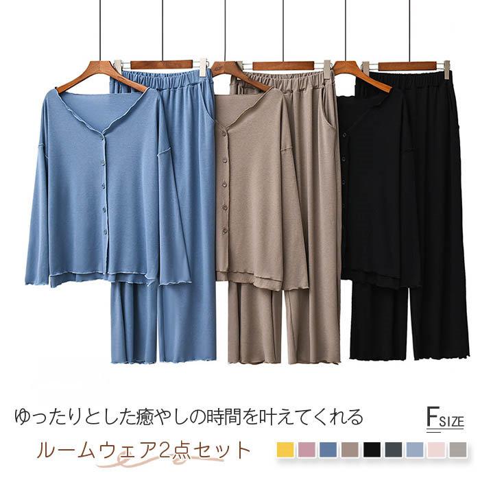 ルームウェア レディース 春夏 薄手 部屋着 モダール セットアップ パジャマ レディース 長袖 無地 前開き ロングパンツ ウエストゴム ワイドパンツ 大人 寝巻き 2点セット 上下セット