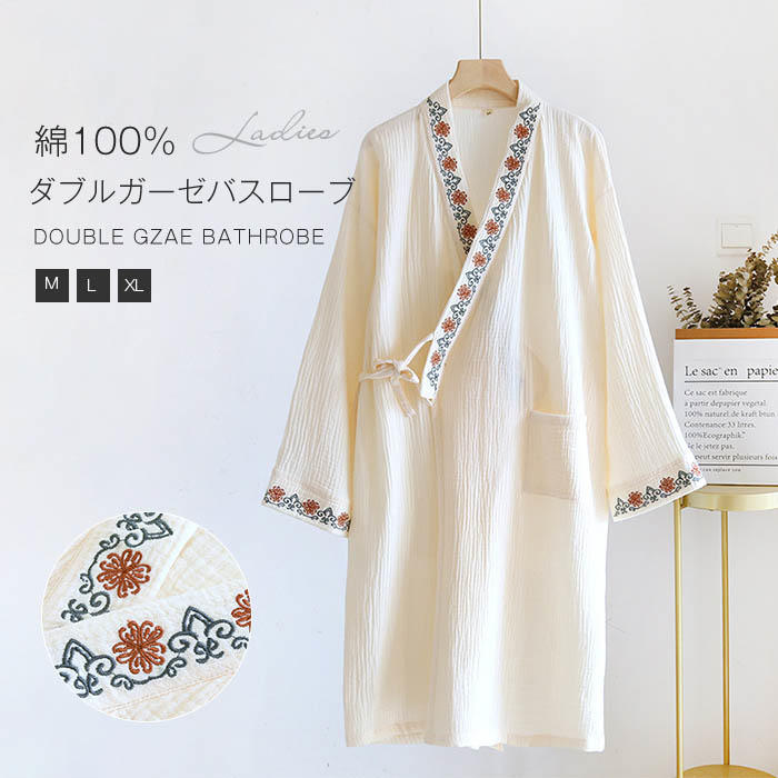 パジャマ レディース ルームウェア 長袖 部屋着 バスローブ ガウン ガーゼ 綿 ガーゼコットン 大人 寝巻き ランジェリー ゆったり ナイトガウン 無地 刺繍 春 夏 秋 体型カバー 柔らかい