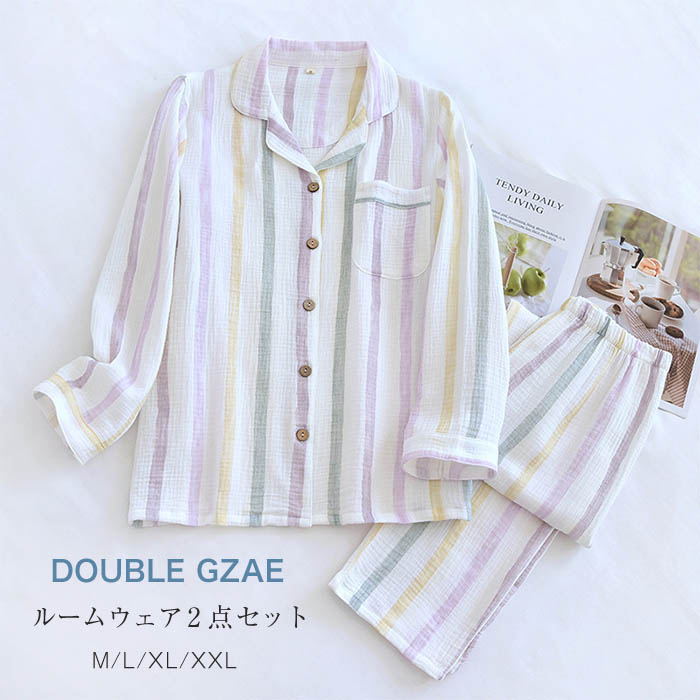 綿100% ダブルガーゼ ルームウェア 2点セット 長袖 トップス 長ズボン パジャマ レディース ガーゼ 部屋着 セットアップ 寝間着 ストライプ柄 春 秋 冬 2重ガーゼ コットン 可愛い