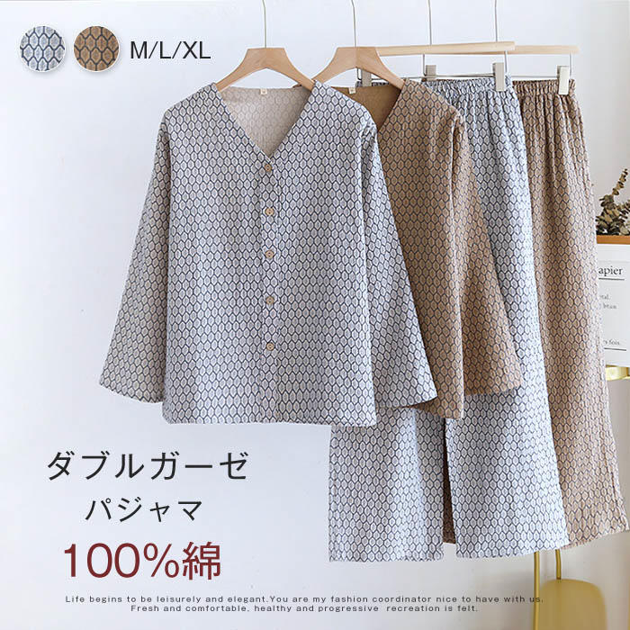 綿100% ダブルガーゼ ルームウェア 2点セット 長袖 トップス vネック 長ズボン パジャマ レディース ガーゼ 部屋着 セットアップ 寝間着 柄 総柄 春 秋 冬 2重ガーゼ コットン セット