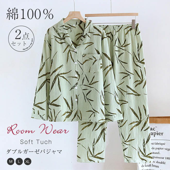 綿100% ダブルガーゼ ルームウェア 2点セット 長袖 トップス 長ズボン パジャマ レディース ガーゼ 部屋着 セットアップ 寝間着 総柄 タケ 竹 春 秋 冬 2重ガーゼ コットン エスニック