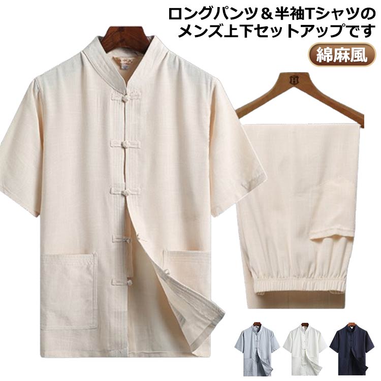 上下セット チャイナ服 半袖 薄手 麻 チャイナシャツ 長ズボン 夏 綿麻風インナー 下着 ナイトウェア メンズ ナイトウェア ルームウェア ルームウェア 上下セット