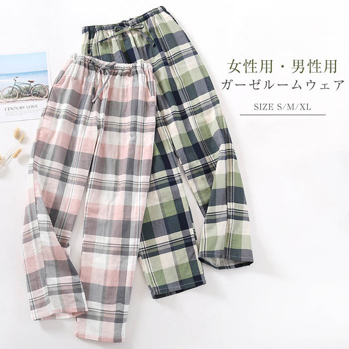 ガーゼ ルームウェア パジャマ ロングパンツ単品 レディース メンズ チェック部屋着 寝間着 春 秋 寝巻き 快適 大きいサイズ 綿100% ベア カップル 2重ガーゼ