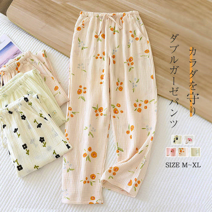 ルームウェア パンツ ガーゼ ルームウェア パジャマ ロングパンツ単品 レディース 春 夏 秋 花柄 総柄 部屋着 寝間着 寝巻き ガーゼパンツ イージーパンツ
