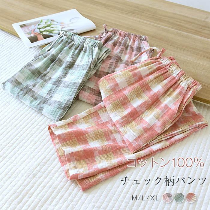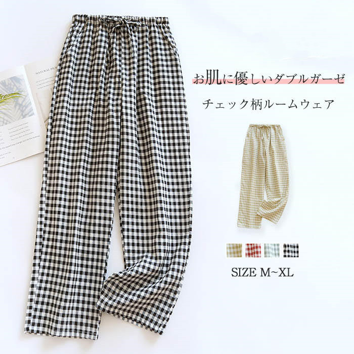 ルームウェア パンツ ガーゼ ルームウェア パジャマ ロングパンツ単品 レディース 春 夏 秋 チェック柄 部屋着 寝間着 寝巻き ガーゼパンツ イージーパンツ 快適