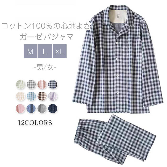 やわらかな肌あたりが心地良い、綿100%のパジャマ カップル セット ルームウェア レディース メンズ ナイトウェア ナイト 柔軟 柔らかい ガーゼ コットン 吸湿性 通気性 チェック