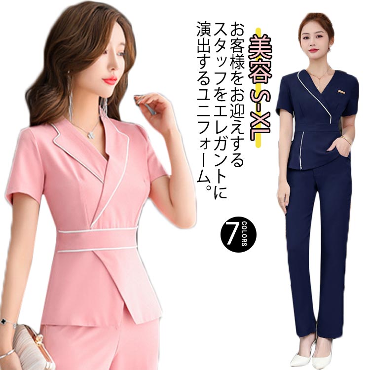 制服 ノーカラー トップス 作業服 ロングパンツ 制服 半袖 vネック セットアップ 韓国 制服 ユニフォーム エステサロン おしゃれ 病院 おしゃれ