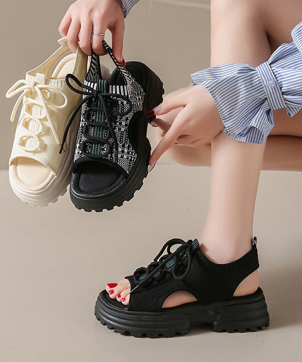 ボリュームソールコンフォートサンダル美脚脚長 歩きやすい カジュアル ニットサンダル 履きやすい靴春夏 軽量くつ 通気性