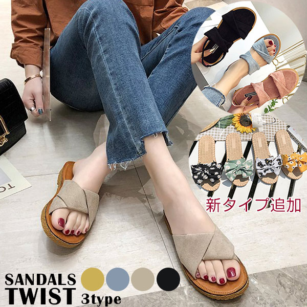 3A21 ツイスト フラットサンダル リボン花柄登場 かわいい サンダル ローヒール 美脚靴ビーチサンダル ストラップサンダル レディース ぺたんこ 夏 トレンド バーゲン