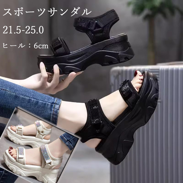 21.5-25.0 スポーツサンダル 厚底 レディース ヒール6 ベルクロ ベルト コンフォート 歩きやすい