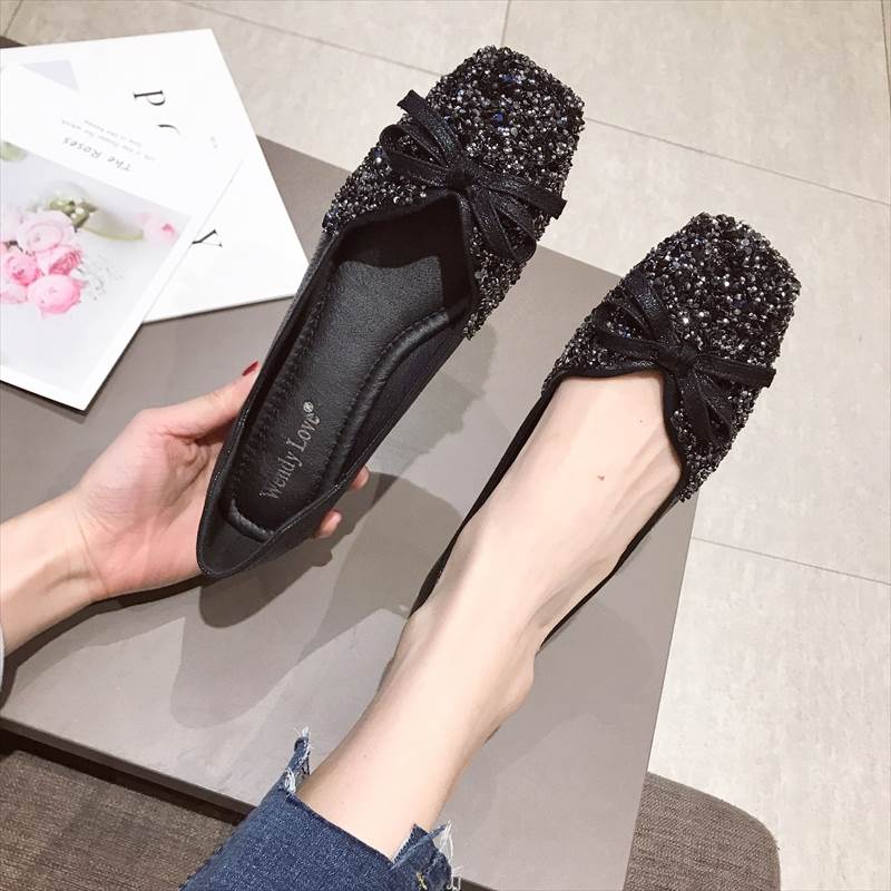 パンプス レディース シューズ ぺたんこ靴 リボン付き きらきら スパンコール ビーズ 装飾 フラット スクエアトゥ ローヒール Vカット 華奢見せ 歩きやすい 疲れにくい キラキラ かわいい
