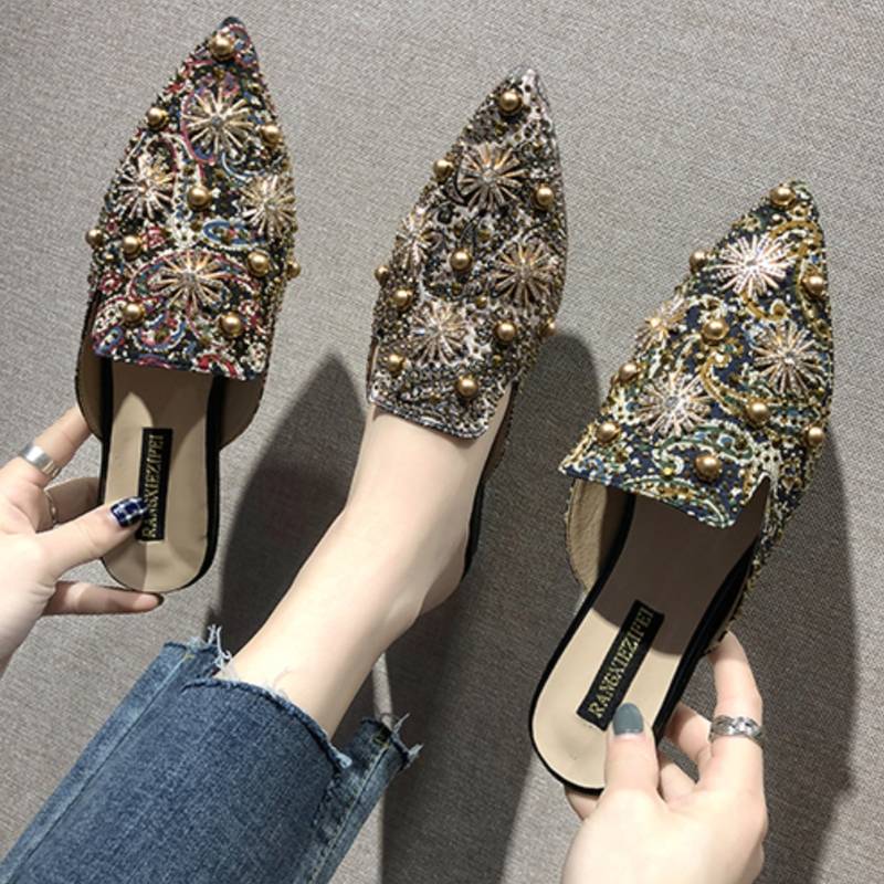 ミュール スリッポン サンダル シューズ ビジュー キラキラ スパンコール レディース ぺたんこ ローヒール フラット キラキラ 大人 可愛い きれいめ おしゃれ 春