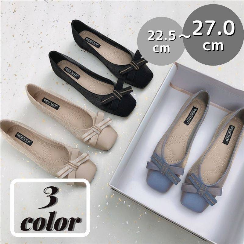 スクエアトゥ フラット パンプス ローヒール 1cmヒール レディース ブラック ブルー アプリコット 3色展開 リボン 歩きやすい 履きやすい 走れる 疲れにくい 休日 お